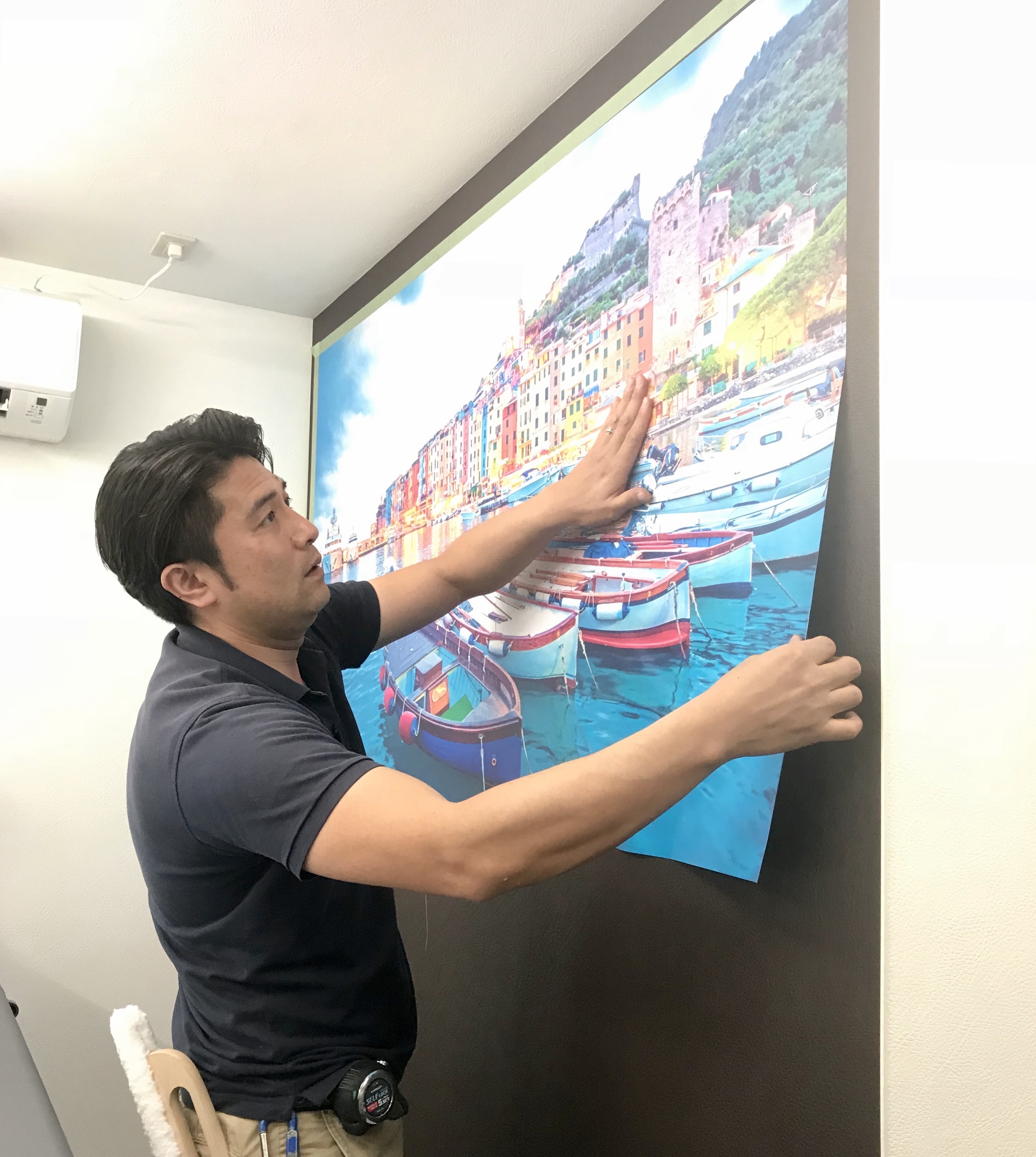 通常のクロスの施工が難しい下地でも施工ができる場合があります。また、サイズも自由に設定できますので、ポスターサイズなどの好きなサイズで印刷が可能です。